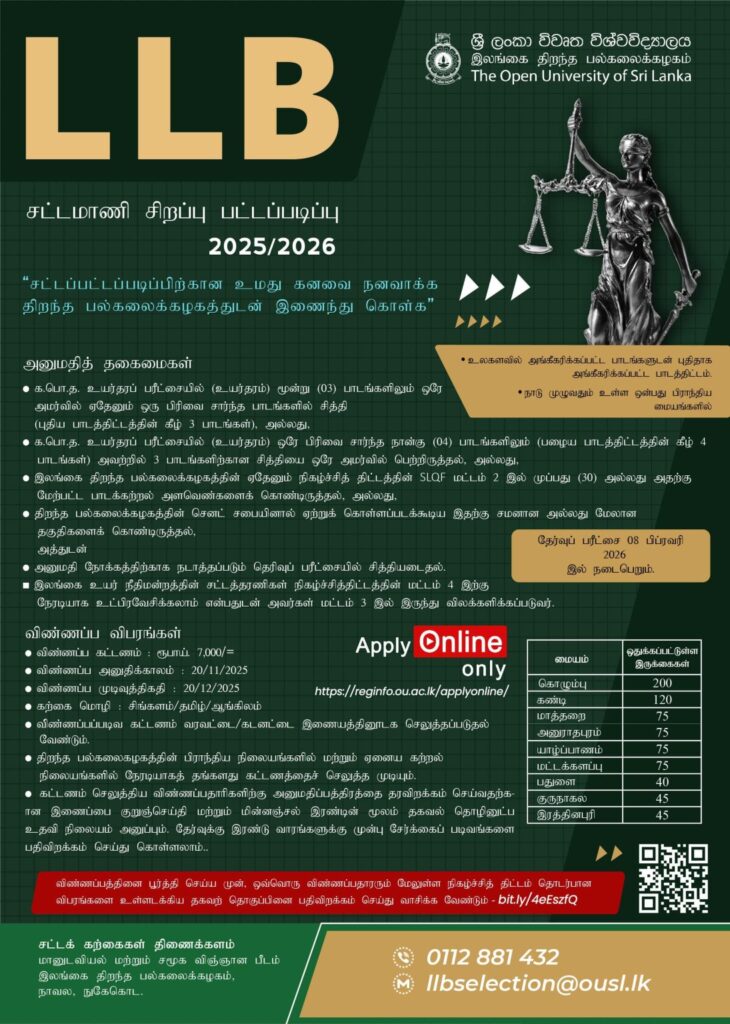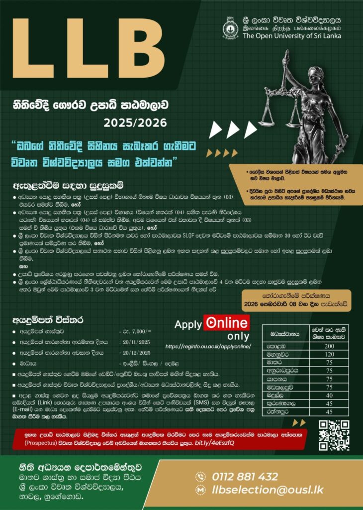 OUSL – The Open University of Sri Lanka is now accepting applications for its prestigious Bachelor of Laws (LLB) Honours Degree Programme for the 2025/2026 academic year.